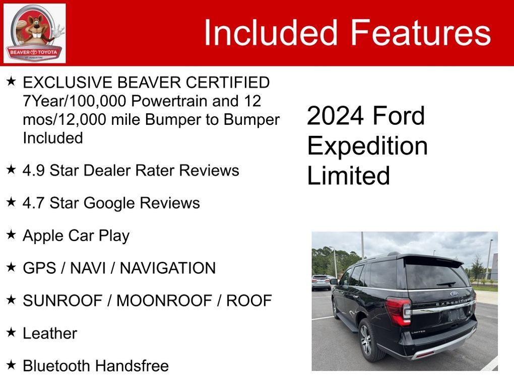 CARFAX One-Owner. Clean CARFAX. Certified. EXCLUSIVE BEAVER CERTIFIED 7Year/100,000 Powertrain and 12 mos/12,000 mile Bumper to Bumper Included, 4.9 Star Dealer Rater Reviews, 4.7 Star Google Reviews, Apple Car Play, GPS / NAVI / NAVIGATION, SUNROOF / MOONROOF / ROOF, Leather, Bluetooth Handsfree, NO ACCIDENTS ON CARFAX REPORT, BEAVER CERTIFIED*7 YEAR/100K MILE WARRANTY*$0 DEDUCTIBLE*BUY WITH PEACE OF MIND, Rear View Camera, 3rd Row / THIRD ROW / 7 Seat Option, LEATHER, One Owner, NONSmoker, Local Trade, MUST SEE!, Fresh Oil Change, Passed Beaver Certified Multi Point Inspection, Passed Dealership Inspection, Freshly Detailed, EXCELLENT CONDITION, Back Up Camera, Blind Spot Monitor, Leather Interior, Alloy Wheels, Power Driver's Seat, Power Passenger Seat, Rear A/C, Power Sunroof, Premium Wheels, LCD Display Screen, Fully Serviced and Detailed.Priced below KBB Fair Purchase Price!Agate Black Metallic 2024 Ford Expedition Limited 4WD EcoBoost 3.5L V6 GTDi DOHC 24V Twin TurbochargedWe provide you with world class service using the most advanced technology to service your car, by our friendly and compassionate team of sales specialists! Our Sales team consists of individuals handpicked to deliver a sales experience like no other. We want your experience to be unique and cater to your individuality. Our Sales team is committed to providing this experience! We want you to know we’re listening, so please, feel free to always let us know how we can better serve you, or merely to express how unique your experience was here at Beaver Toyota!!Certification Program Details: EXCLUSIVE BEAVER CERTIFIED WARRANTY includes 7 Year/100,000 Miles Powertrain Coverage 12 Months/12,000 Bumper to Bumper CoverageTHIS VEHICLE IS BEAVER CERTIFIED: • 7 year/ 100,000 mile powertrain warranty o Protection covers engine, transmission and front/rear wheel drive • 12 month/ 12,000 mile limited warranty o Comprehensive protection on additional components • 24 hour roadside assistance o Towing, lock out and fuel services • Nationwide coverage o Effective anywhere in the US • Special Financing rates o Attractive finance options for certified vehicles THIS VEHICLE HAS BEEN PROFESSIONALLY HAND PICKED, SERVICED AND DETAILED TO INCLUDE *$2000 IN RECENT VEHICLE INVESTMENTS: • Multi Point Inspection o Visually inspect all safety components o Check fluids, belts, brakes, tires, batteries etc o Certified technician road test • Oil and Filter Service o Replace oil and filters o Replace cabin filter o Replace air filter • Interior and Exterior Detailing o Thoroughly Vacuum o Thoroughly Clean Interior Surfaces and Panels o Treat with Conditioners o Interior Control Cleaning o Hand Wash and Wax o Clean Door Jambs and Hinges o Clean Rims, Tires and Windows o Clean Engine Compartment Disclaimer: *$2000 based on average reconditioning costs. WHY BEAVER TOYOTA ST AUGUSTINE? GUEST EXPERIENCE: At Beaver Toyota St Augustine, we’re here to WOW YA and our staff is 100% dedicated to customer satisfaction. We understand that you want a fast, fair and transparent experience throughout the car buying process and every member of our team is equipped to help. WE GIVE BACK: We believe in paying it forward and taking care of our community. With that in mind, every purchase helps support local schools, nonprofit organizations and businesses through our Acts of Wow. FINANCING OPTIONS: Take advantage of our attractive low-rate financing options. We have access to credit unions and national banks to provide financing for most credit levels. We can tailor a finance package to fit your needs. To get started, complete our secure online credit application.
