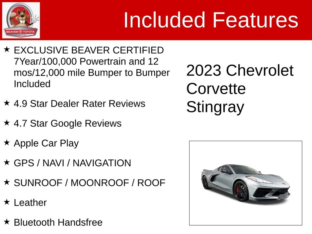 Clean CARFAX. Certified. EXCLUSIVE BEAVER CERTIFIED 7Year/100,000 Powertrain and 12 mos/12,000 mile Bumper to Bumper Included, 4.9 Star Dealer Rater Reviews, 4.7 Star Google Reviews, Apple Car Play, GPS / NAVI / NAVIGATION, SUNROOF / MOONROOF / ROOF, Leather, Bluetooth Handsfree, NO ACCIDENTS ON CARFAX REPORT, BEAVER CERTIFIED*7 YEAR/100K MILE WARRANTY*$0 DEDUCTIBLE*BUY WITH PEACE OF MIND, Rear View Camera, LEATHER, One Owner, NONSmoker, Local Trade, MUST SEE!, Fresh Oil Change, Passed Beaver Certified Multi Point Inspection, Passed Dealership Inspection, Freshly Detailed, EXCELLENT CONDITION, Back Up Camera, Blind Spot Monitor, Leather Interior, Alloy Wheels, Power Driver's Seat, Power Sunroof, Premium Wheels, LCD Display Screen, Fully Serviced and Detailed, LOOK AT THE MILES ON THIS FULLY SERVICED CORVETTE ,AND YES ITS ALSO CERTIFIED ,SOMETHING NO OTHER DEALER CAN DO ,WE CAN CERTIFY ANY TOYOTA PRODUCT IN A USED CAR ,HOW ABOUT THIS FOR PEACE OF MIND ,SO WHY EVEN THINKING ABOUT BUYING ANYWHERE ELSE IN THIS MARKET ,THE PEACE OF MIND WHEN BUYING A USED CR ITS ONLY HERE AT BEAVER TOYOTA IN LITTLE ST AUGUSTINE!!, Navigation System.