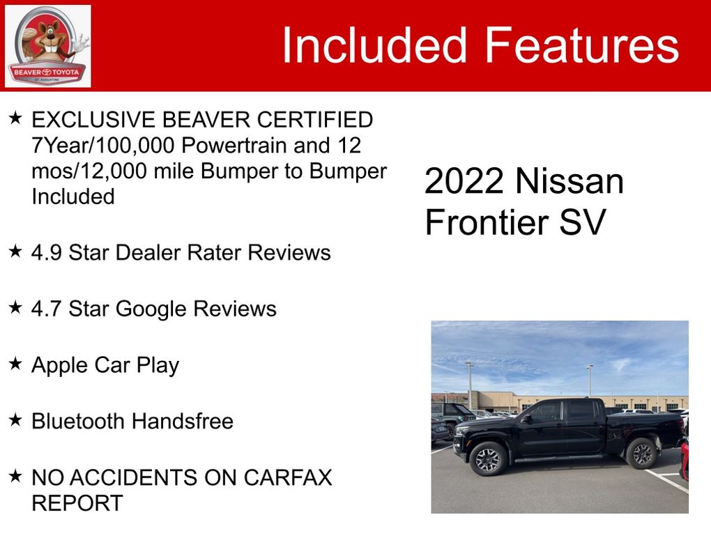 This Frontier is Beaver Certified, meaning it has undergone a rigorous multi-point inspection and comes with an unbeatable 7-year/100,000-mile powertrain warranty and 12-month/12,000-mile bumper-to-bumper coverage. You can purchase with confidence, knowing this truck has been thoroughly inspected and serviced to the highest standards.