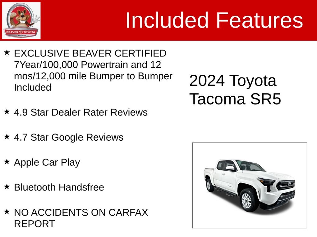 Discover the perfect blend of capability, technology, and reliability with this 2024 Toyota Tacoma SR5. Experience the difference that BEAVER CERTIFIED quality and service can make. We provide you with world class service using the most advanced technology to service your car, by our friendly and compassionate team of sales specialists! Our Sales team consists of individuals handpicked to deliver a sales experience like no other. We want your experience to be unique and cater to your individuality. Our Sales team is committed to providing this experience! We want you to know we're listening, so please, feel free to always let us know how we can better serve you, or merely to express how unique your experience was here at Beaver Toyota!