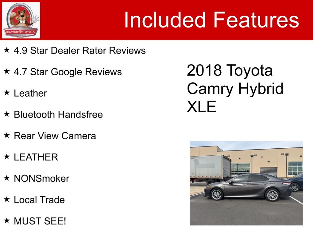 4.9 Star Dealer Rater Reviews, 4.7 Star Google Reviews, Leather, Bluetooth Handsfree, Rear View Camera, LEATHER, NONSmoker, Local Trade, MUST SEE!, Fresh Oil Change, Passed Dealership Inspection, Freshly Detailed, EXCELLENT CONDITION, Back Up Camera, Blind Spot Monitor, Leather Interior, Alloy Wheels, Power Driver's Seat, Premium Wheels, LCD Display Screen, Fully Serviced and Detailed, THIS 2018 HYBRID CAMRY IS BEING FULLY SERVICED AND INSPECTED LIKE NO OTHER USED CAR IN THE MARKET ,WE MAKE SURE WE PROVIDE SAFETY AND PEACE OF MINDFOR OUR CUSTOMERS ,BUY THE BEST SERVICED USED CAR IN THE MARKET!!, 2.5L I4 Hybrid DOHC.