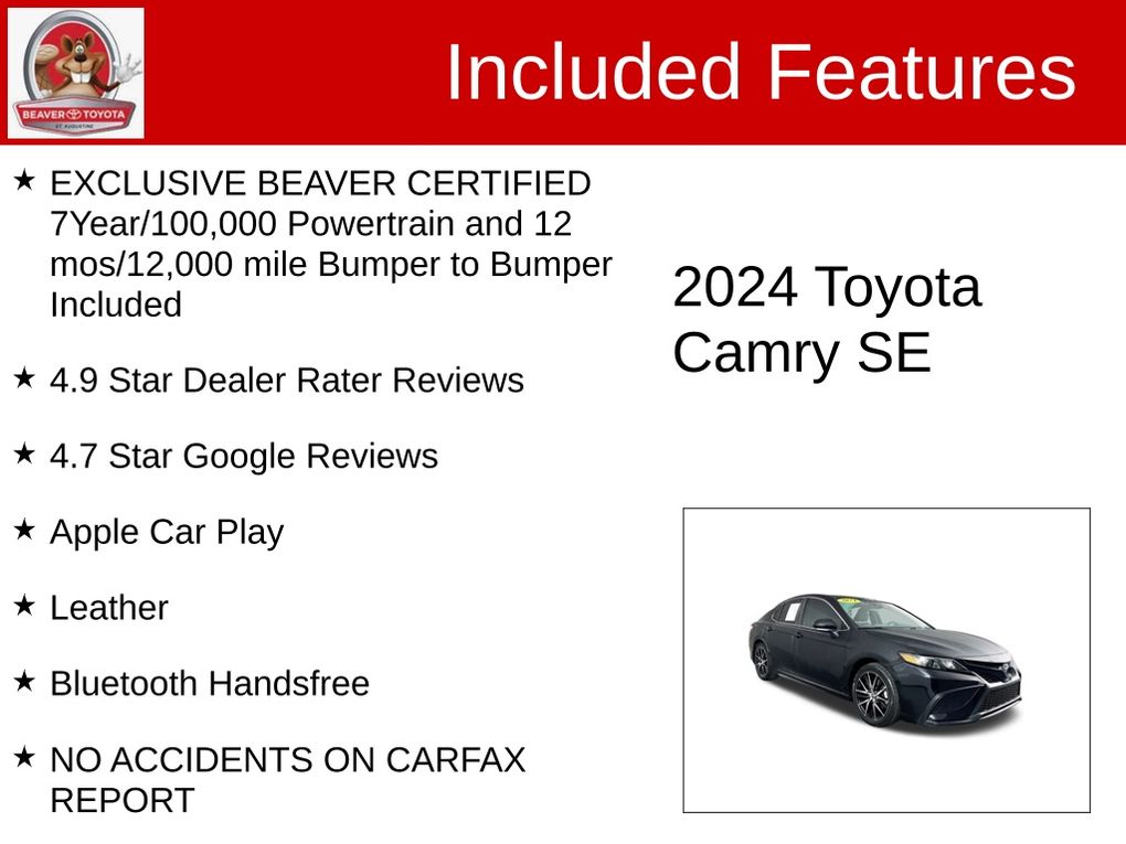 THIS VEHICLE IS BEAVER CERTIFIED: • 7 year/ 100,000 mile powertrain warranty o Protection covers engine, transmission and front/rear wheel drive • 12 month/ 12,000 mile limited warranty o Comprehensive protection on additional components • 24 hour roadside assistance o Towing, lock out and fuel services • Nationwide coverage o Effective anywhere in the US • Special Financing rates o Attractive finance options for certified vehicles THIS VEHICLE HAS BEEN PROFESSIONALLY HAND PICKED, SERVICED AND DETAILED TO INCLUDE *$2000 IN RECENT VEHICLE INVESTMENTS: • Multi Point Inspection o Visually inspect all safety components o Check fluids, belts, brakes, tires, batteries etc o Certified technician road test • Oil and Filter Service o Replace oil and filters o Replace cabin filter o Replace air filter • Interior and Exterior Detailing o Thoroughly Vacuum o Thoroughly Clean Interior Surfaces and Panels o Treat with Conditioners o Interior Control Cleaning o Hand Wash and Wax o Clean Door Jambs and Hinges o Clean Rims, Tires and Windows o Clean Engine Compartment Disclaimer: *$2000 based on average reconditioning costs. WHY BEAVER TOYOTA ST AUGUSTINE? GUEST EXPERIENCE: At Beaver Toyota St Augustine, we’re here to WOW YA and our staff is 100% dedicated to customer satisfaction. We understand that you want a fast, fair and transparent experience throughout the car buying process and every member of our team is equipped to help. WE GIVE BACK: We believe in paying it forward and taking care of our community. With that in mind, every purchase helps support local schools, nonprofit organizations and businesses through our Acts of Wow. FINANCING OPTIONS: Take advantage of our attractive low-rate financing options. We have access to credit unions and national banks to provide financing for most credit levels. We can tailor a finance package to fit your needs. To get started, complete our secure online credit application.