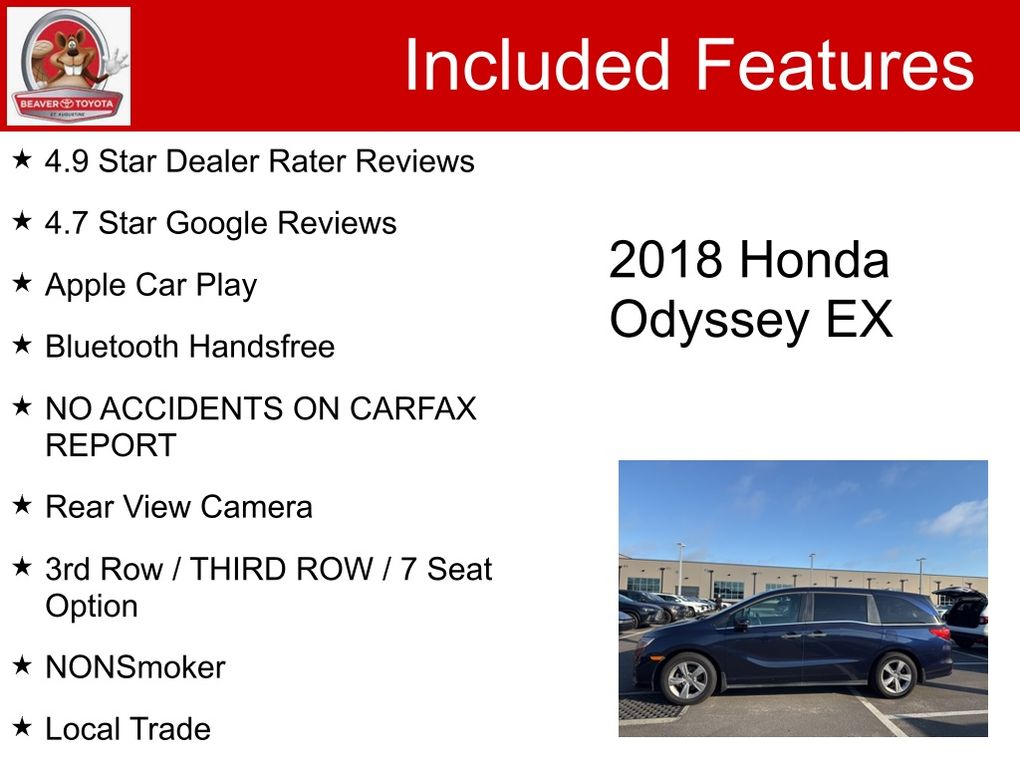 At our dealership, we take pride in offering our customers exceptional vehicles like this 2018 Honda Odyssey EX. Our commitment to excellence is evident in every aspect of our business, from the quality of our inventory to the exceptional customer service we provide. We invite you to experience the difference for yourself and schedule a test drive today. This Odyssey won't be on our lot for long, so don't miss your chance to make it part of your family's story.