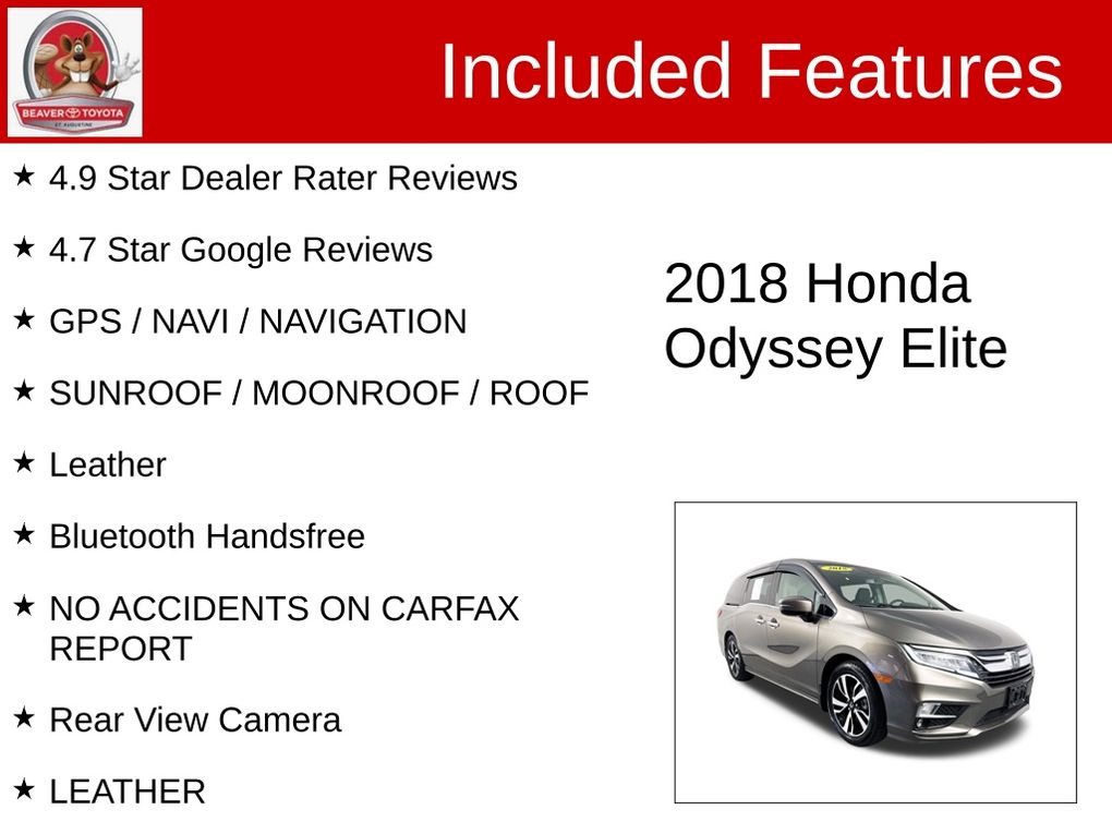 Discover the unparalleled combination of style, performance, and family-focused features that make this 2018 Honda Odyssey Elite a must-see. Visit our showroom today and experience the difference for yourself. We're confident you'll be impressed by the exceptional quality and value this vehicle offers.