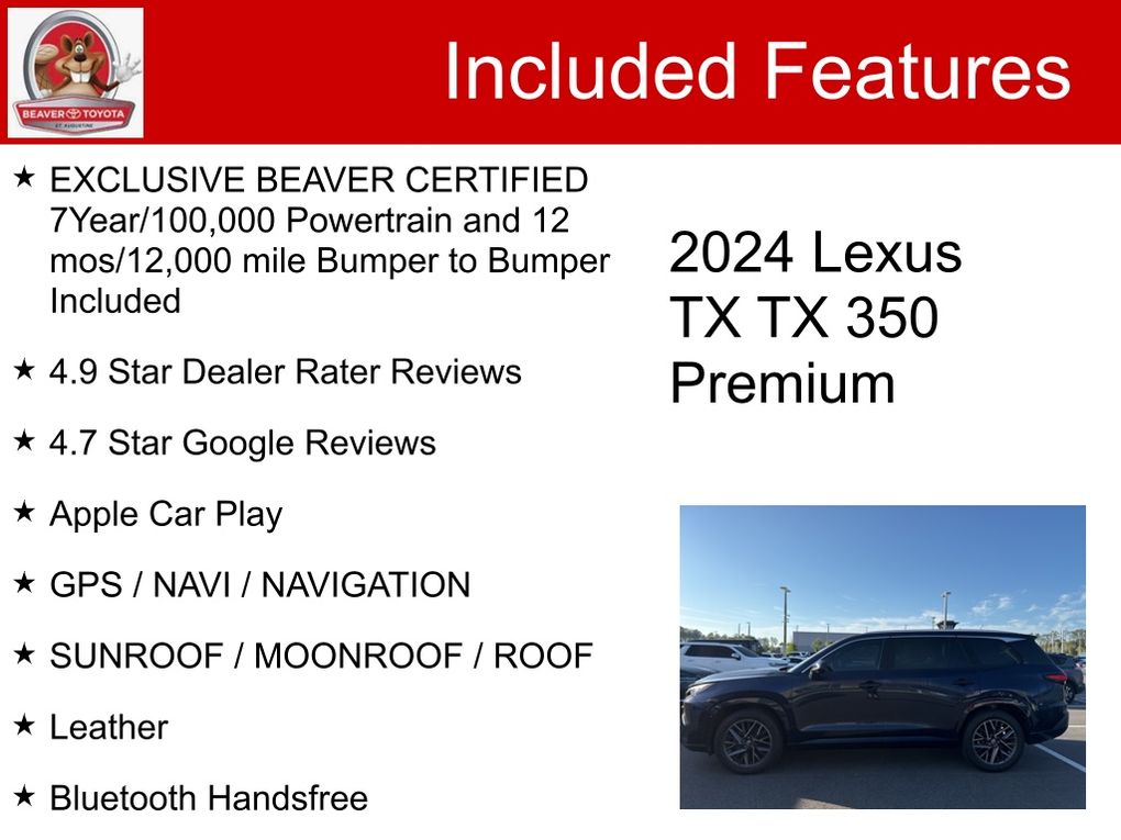This Lexus TX 350 Premium has been expertly certified, ensuring you can purchase with confidence. Backed by our exclusive Beaver Certified 7-Year/100,000-Mile Powertrain Warranty and 12-Month/12,000-Mile Bumper-to-Bumper Warranty, this vehicle is the epitome of peace of mind.