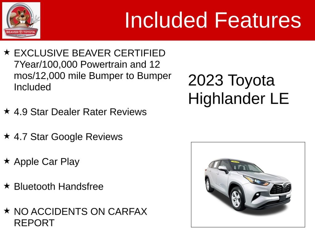 Don't miss your opportunity to own this exceptional 2023 Toyota Highlander LE. Schedule a test drive today and discover why this SUV is the perfect choice for your next vehicle. With unbeatable value and a commitment to your satisfaction, we're confident you'll drive away in the Highlander of your dreams.