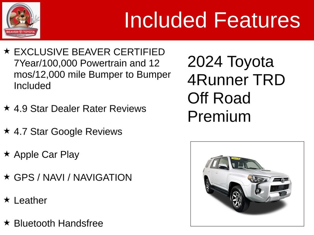Classic Silver Metallic 2024 Beaver Toyota 4Runner TRD Off-Road Premium is a 4D Sport Utility 4WD . This Florida SUV has a 4.0L V6 DOHC 24V engine. Call right now and schedule a test drive. Ask for stock number A286641, the Florida 2024 Beaver Toyota 4Runner . Shop Us Online at www.beavertoyotastaugustine.com. Serving Jacksonville, Palm Coast, Daytona, Gainesville and St Augustine. Beaver Toyota St Augustine on 2995 US Hwy 1 South in St Augustine.