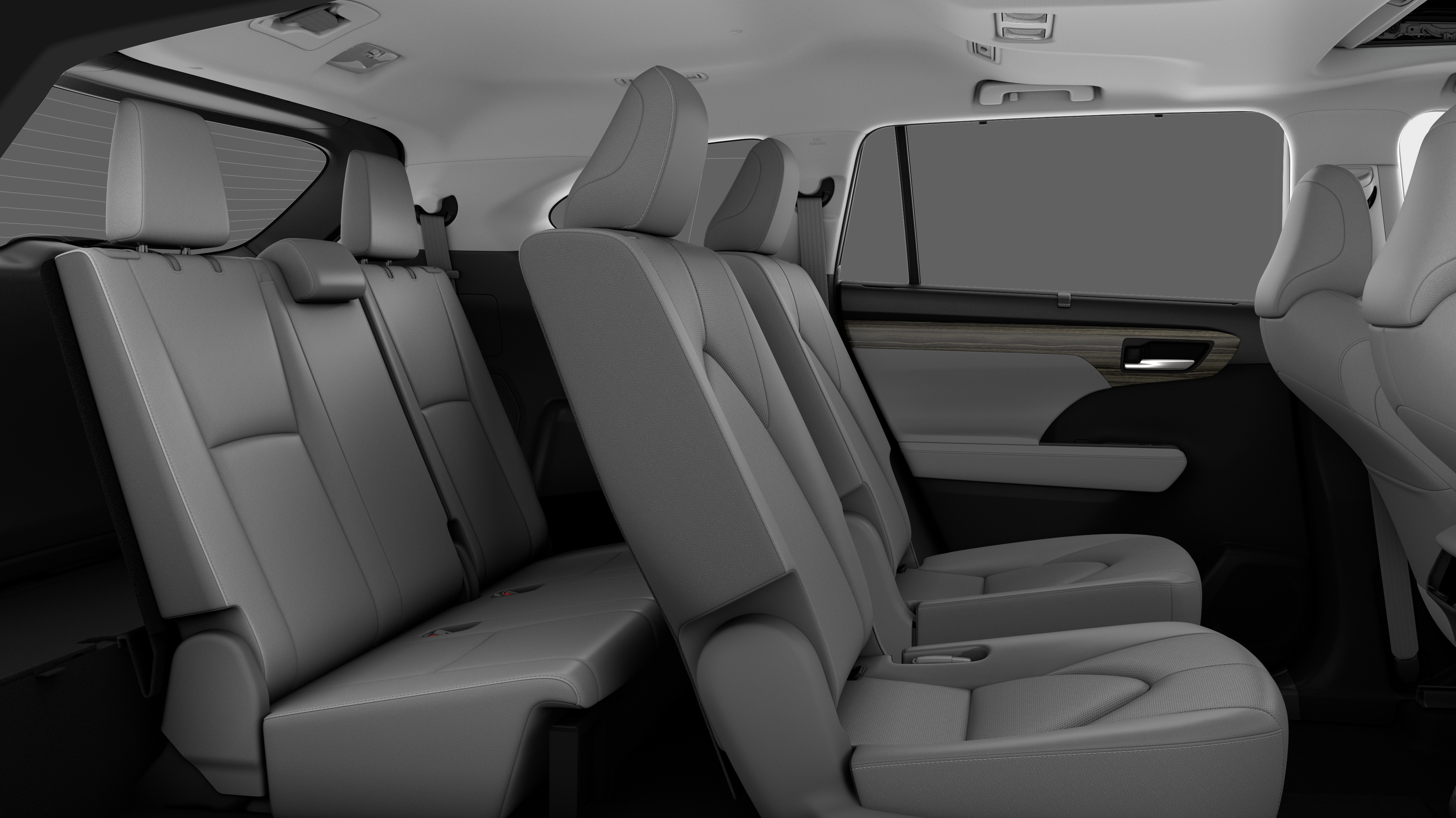 - 7-passenger seating with second-row fold-down captain's chairs and fold-down inboard armrests, adjustable headrests and two cup holders mounted on the floor; and 60/40 split, fold-flat third-row seats with sliding headrests and recline function