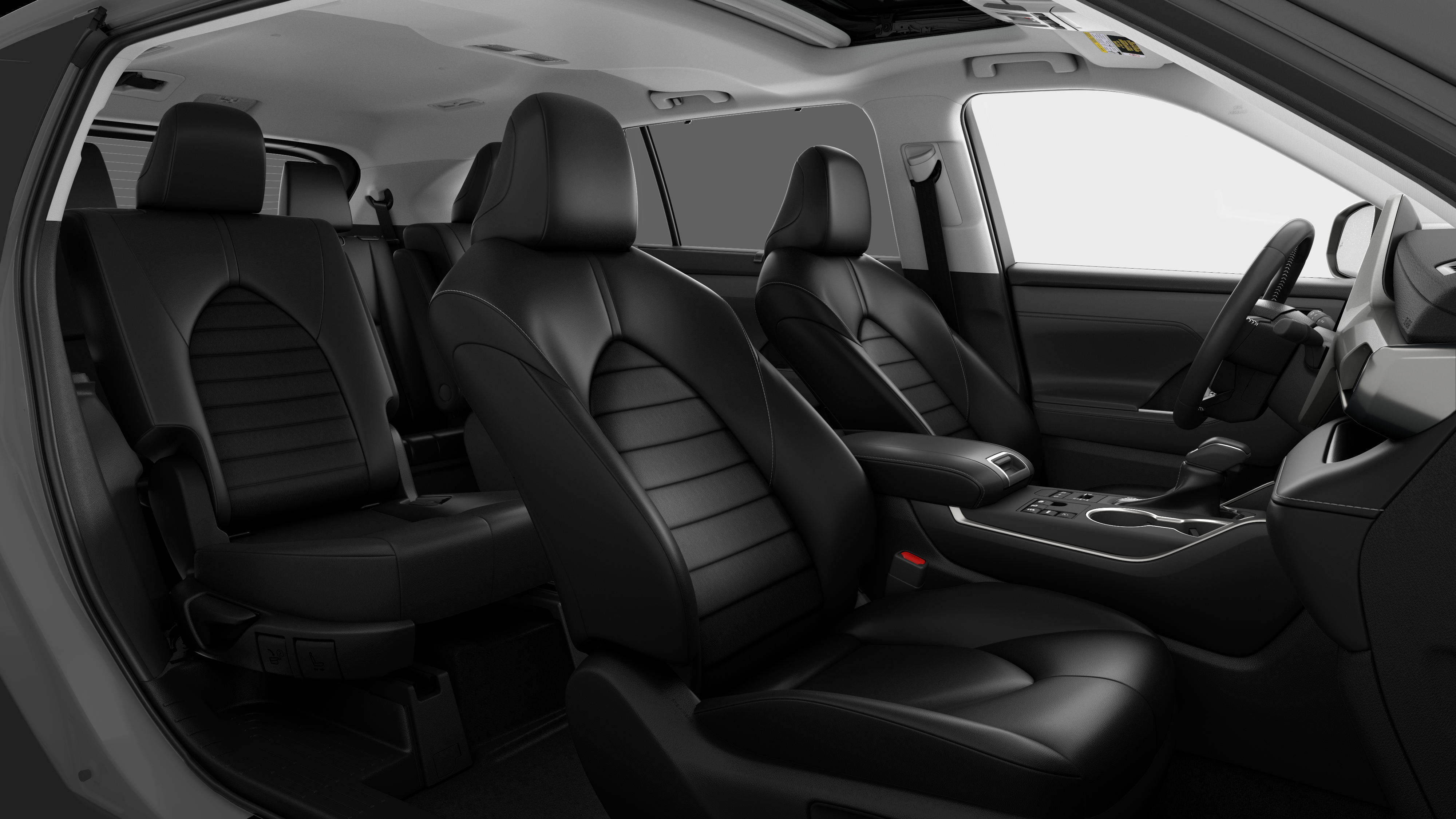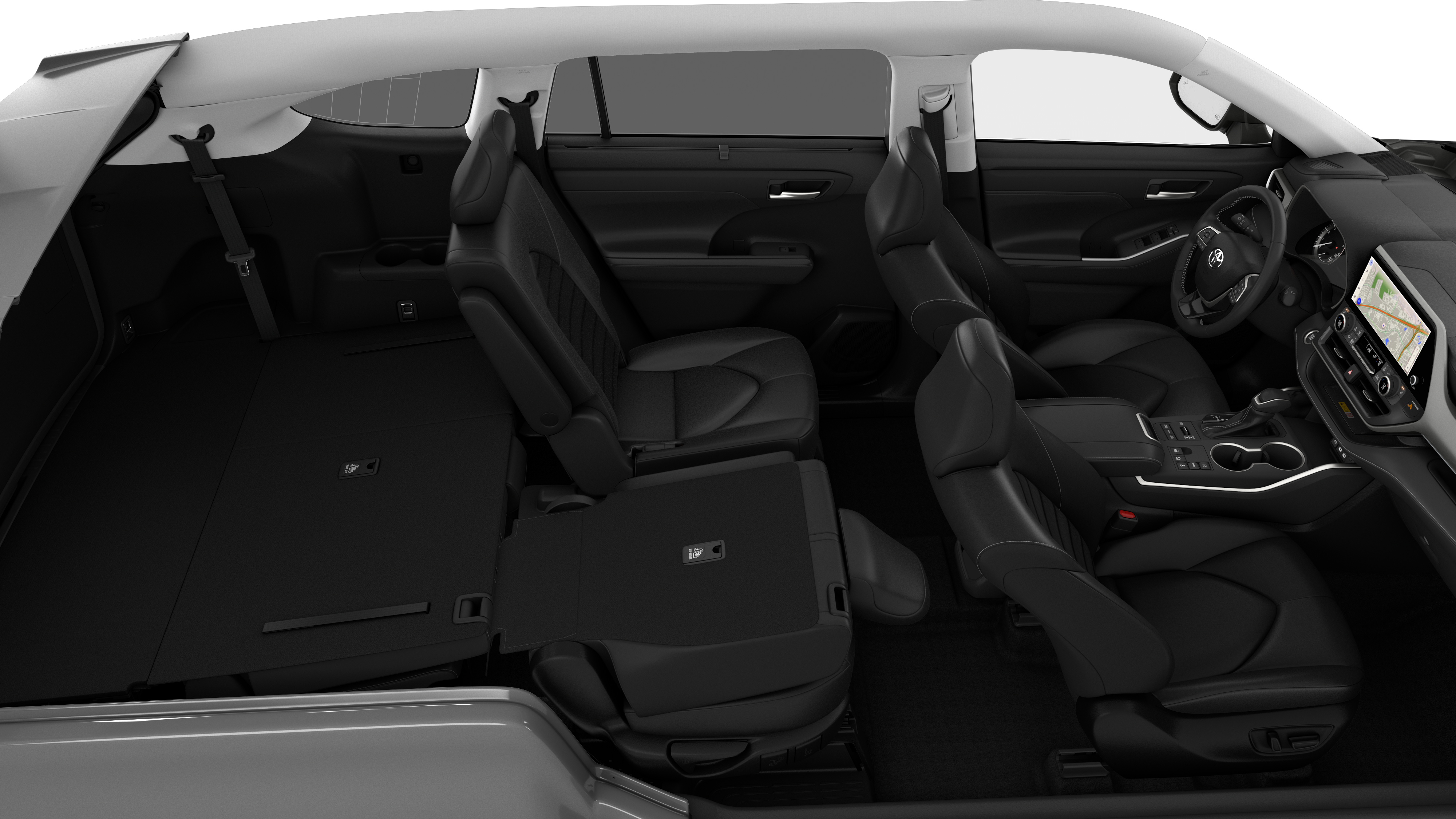 - 7-passenger seating with second-row fold-down captain's chairs and fold-down inboard armrests, adjustable headrests and two cup holders mounted on the floor; and 60/40 split, fold-flat third-row seats with sliding headrests and recline function