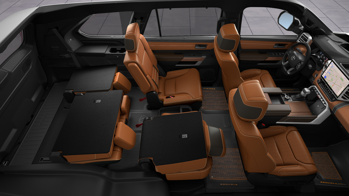 V6 Hybrid, 10-Speed Automatic, 4WD, 14 Speakers, 20" Alloy Wheels, 3rd row seats: split-bench, 4-Wheel Disc Brakes, ABS brakes, Air Conditioning, Alloy wheels, AM/FM radio: SiriusXM, Anti-whiplash front head restraints, Apple CarPlay/Android Auto, Auto High-beam Headlights, Auto tilt-away steering wheel, Auto-dimming door mirrors, Auto-dimming Rear-View mirror, Automatic temperature control, Brake assist, Bumpers: body-color, Compass, Delay-off headlights, Driver door bin, Driver vanity mirror, Dual front impact airbags, Dual front side impact airbags, Electronic Stability Control, Emergency communication system: Safety Connect (10-year trial), Exterior Parking Camera Rear, Front anti-roll bar, Front Bucket Seats, Front Center Armrest w/Storage, Front dual zone A/C, Front fog lights, Front reading lights, Front wheel independent suspension, Fully automatic headlights, Garage door transmitter: HomeLink, Genuine wood door panel insert, Headlight cleaning, Heated and Ventilated Front Seats, Heated door mirrors, Heated front seats, Heated rear seats, Heated steering wheel, Illuminated entry, Knee airbag, Leather Shift Knob, Leather steering wheel, Low tire pressure warning, Memory seat, Navigation system: Drive Connect (1 year trial) includes Cloud Navigation with real time traffic and Google POI, Occupant sensing airbag, Outside temperature display, Overhead airbag, Overhead console, Panic alarm, Passenger door bin, Passenger vanity mirror, Power door mirrors, Power driver seat, Power Liftgate, Power moonroof, Power passenger seat, Power steering, Power windows, Premium audio system: JBL, Premium Leather Seat Trim, Radio: 14" Toyota Audio Multimedia with JBL Premium Audio, Rain sensing wipers, Rear air conditioning, Rear reading lights, Rear seat center armrest, Rear window defroster, Rear window wiper, Reclining 3rd row seat, Remote keyless entry, Security system, Speed control, Speed-sensing steering, Split folding rear seat, Spoiler, Sport steering wheel, Steering wheel mounted audio controls, Tachometer, Telescoping steering wheel, Tilt steering wheel, Traction control, Trip computer, Turn signal indicator mirrors, Variably intermittent wipers, Ventilated front seats, Ventilated rear seats, and Voltmeter.