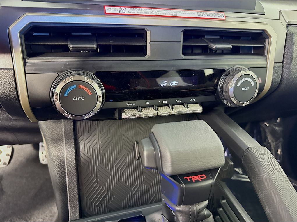3.583 Axle Ratio, 4-Wheel Disc Brakes, 6 Speakers, ABS brakes, Air Conditioning, Alloy wheels, AM/FM radio: SiriusXM, Anti-whiplash front head restraints, Apple CarPlay/Android Auto, Auto High-beam Headlights, Auto-dimming Rear-View mirror, Automatic temperature control, Brake assist, Bumpers: body-color, Driver door bin, Driver vanity mirror, Dual front impact airbags, Dual front side impact airbags, Electronic Stability Control, Emergency communication system: Safety Connect (up to 10-year trial subscription), Exterior Parking Camera Rear, Fabric Seat Trim, Four wheel independent suspension, Front anti-roll bar, Front Bucket Seats, Front Center Armrest, Front fog lights, Front reading lights, Fully automatic headlights, Heated door mirrors, Illuminated entry, Knee airbag, Leather Shift Knob, Leather steering wheel, Low tire pressure warning, Occupant sensing airbag, Outside temperature display, Overhead airbag, Overhead console, Panic alarm, Passenger door bin, Passenger vanity mirror, Power door mirrors, Power steering, Power windows, Radio: 8" Toyota Audio Multimedia, Rear step bumper, Rear window defroster, Remote keyless entry, Security system, Speed control, Speed-sensing steering, Split folding rear seat, Steering wheel mounted audio controls, Tachometer, Telescoping steering wheel, Tilt steering wheel, Traction control, Trip computer, Turn signal indicator mirrors, Variably intermittent wipers, and Wheels: 18" TRD Sport Alloy.
