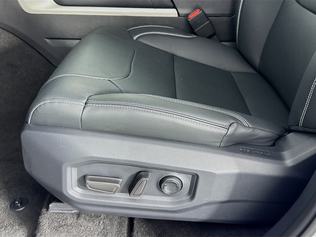 - Leather-trimmed seats with contrast stitching; 8-way power-adjustable driver and front passenger seats with power-adjustable lumbar support