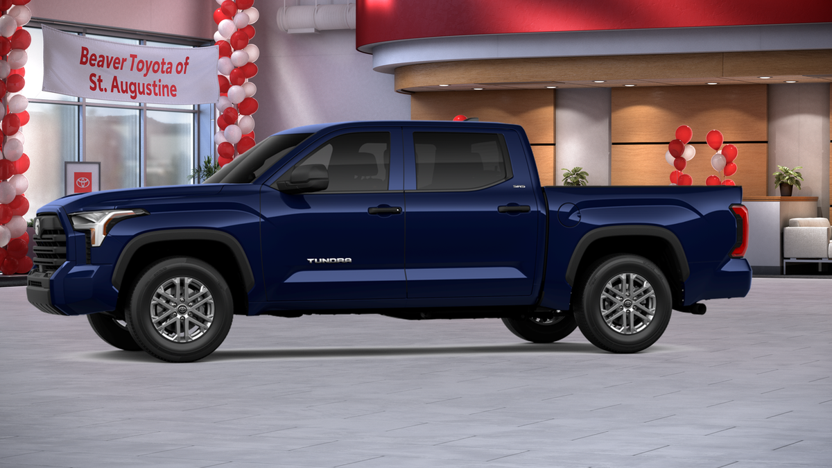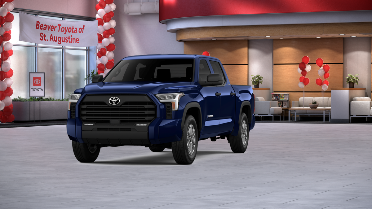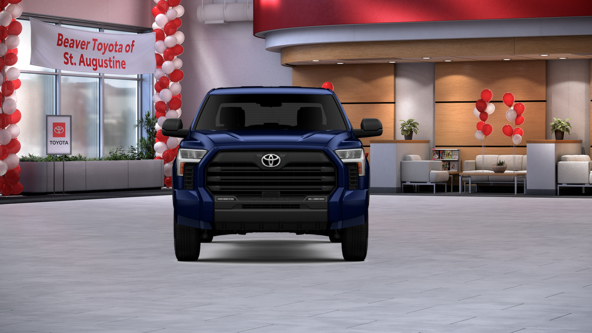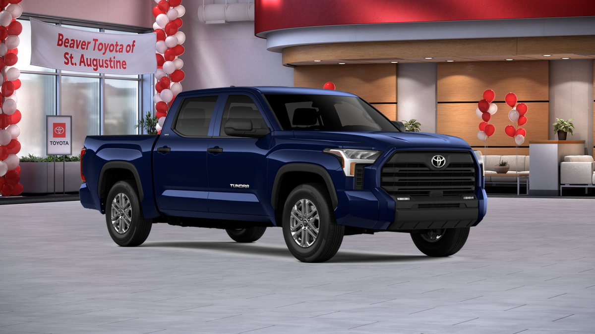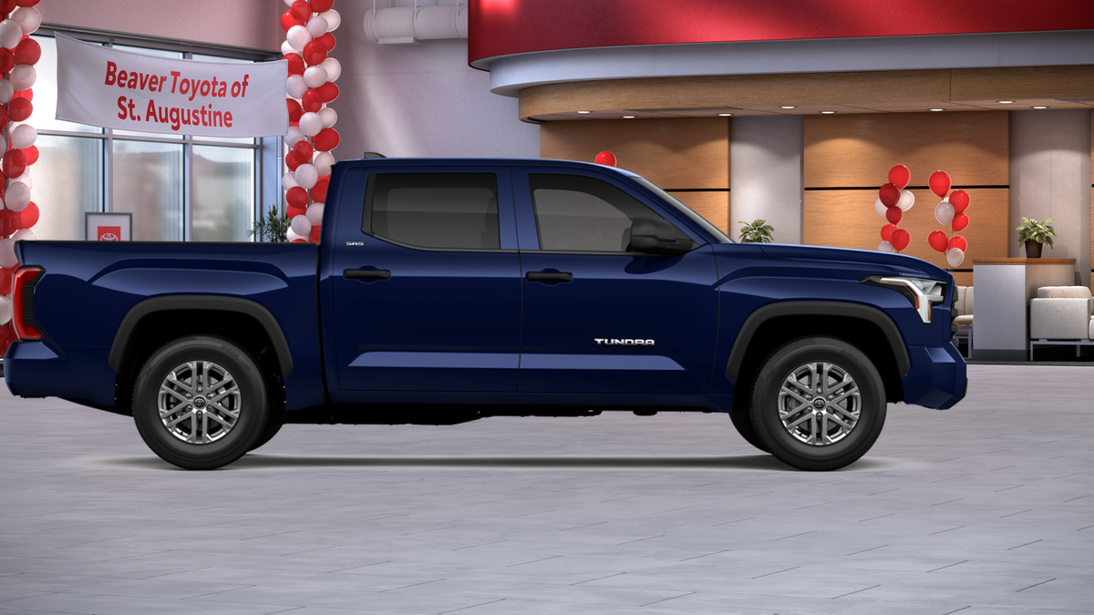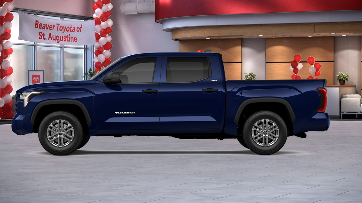 The exterior of this Tundra is dressed in a stunning Blue hue, complemented by alloy wheels and a sleek, modern design. Step inside and you'll be greeted by a spacious and well-appointed interior, featuring fabric or leather seat trim, a front center armrest, and an array of advanced technology features, including Apple CarPlay and Android Auto.