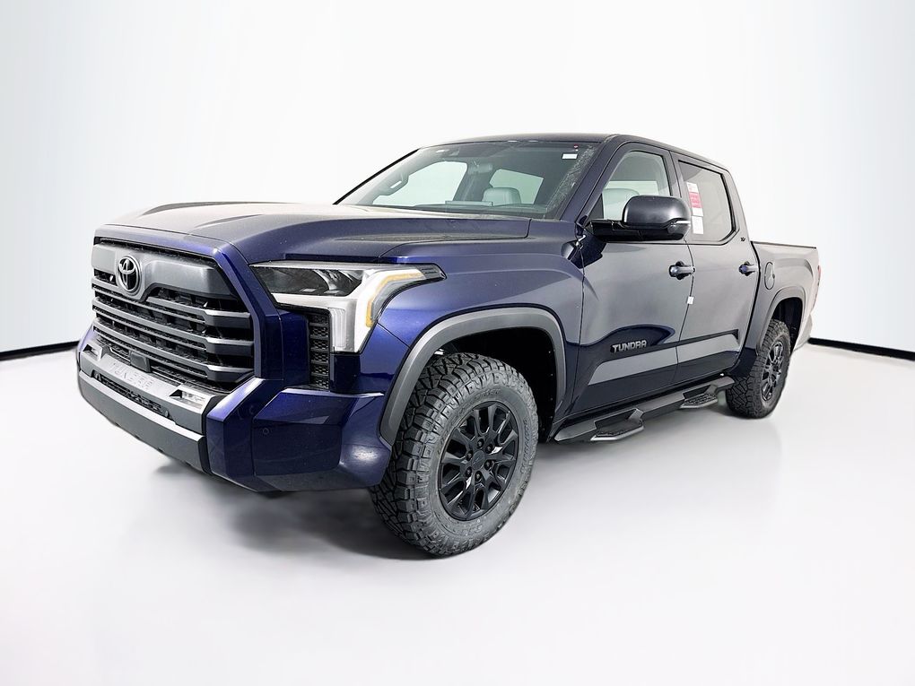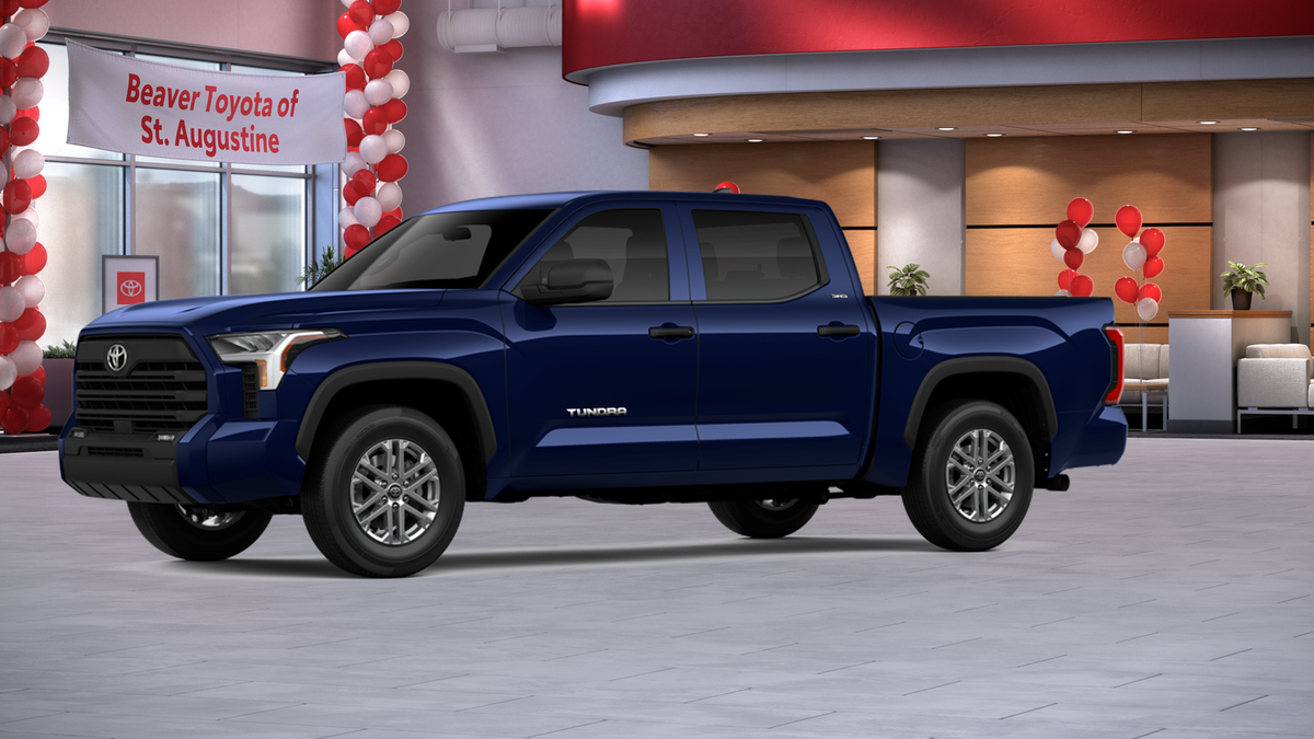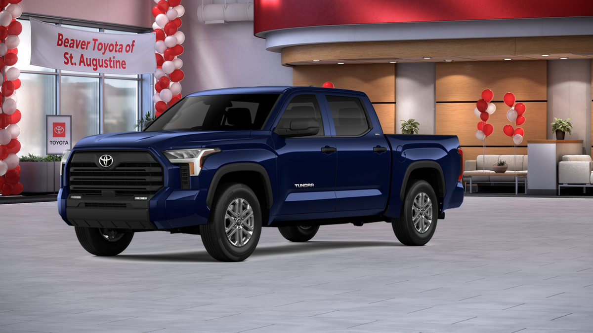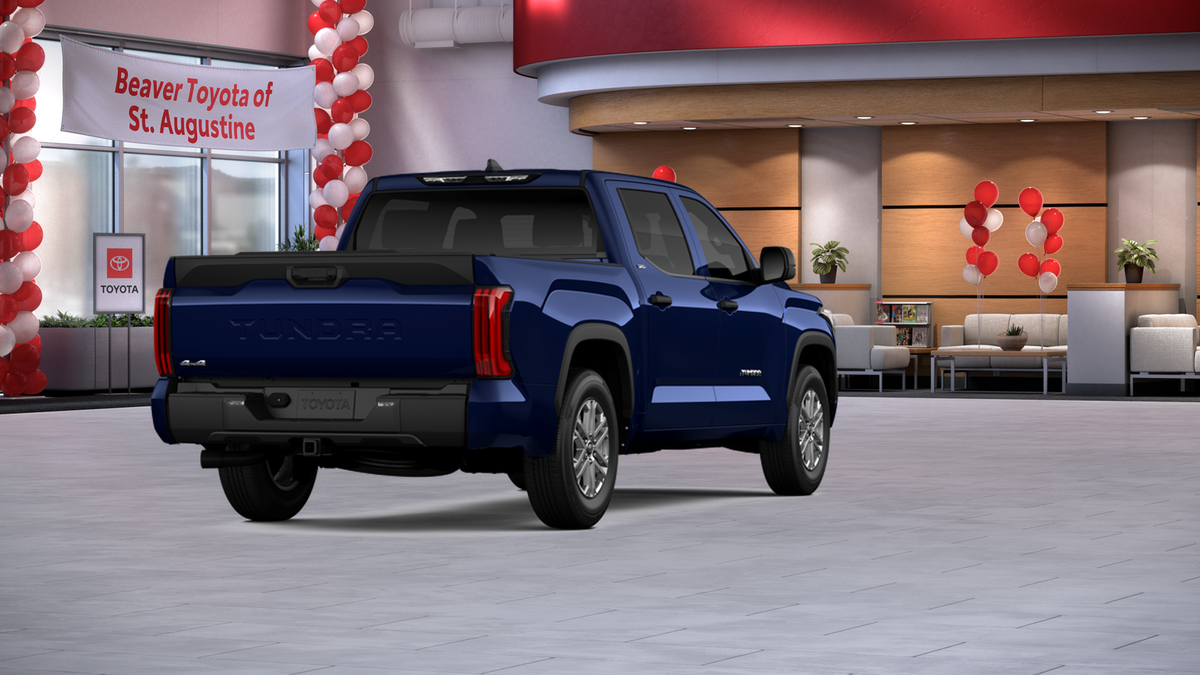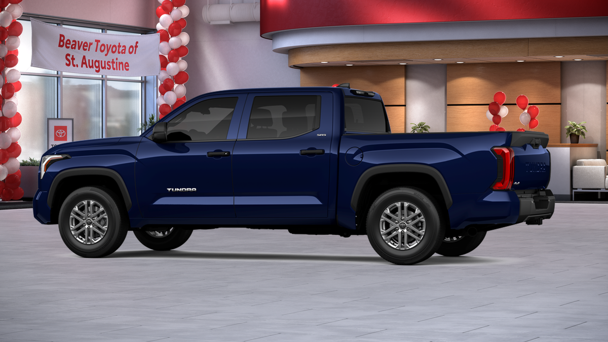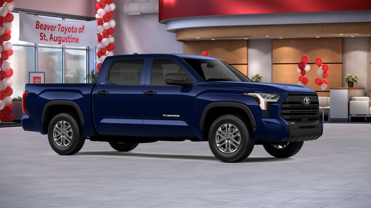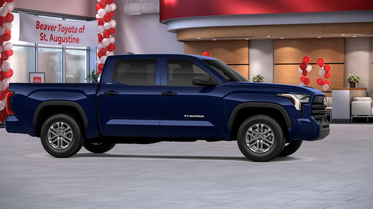 The exterior of this Tundra is dressed in a stunning Blue hue, complemented by alloy wheels and a sleek, modern design. Step inside and you'll be greeted by a spacious and well-appointed interior, featuring fabric or leather seat trim, a front center armrest, and an array of advanced technology features, including Apple CarPlay and Android Auto.