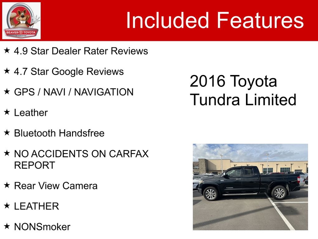 Whether you're tackling tough jobs or embarking on your next adventure, the 2016 Toyota Tundra Limited is ready to rise to the occasion. Experience the power, comfort, and versatility of this exceptional truck today. Contact us to schedule a test drive and see for yourself why the Tundra is the ultimate choice for those who demand the best.