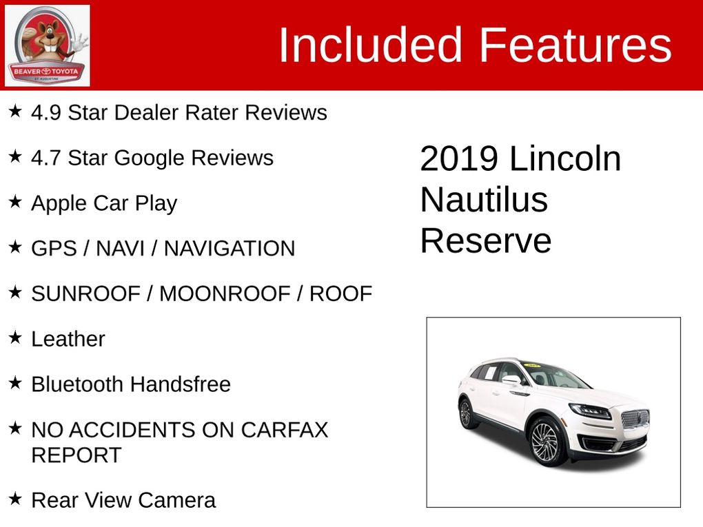 Experience the exceptional craftsmanship and refined elegance of the 2019 Lincoln Nautilus Reserve. This SUV is a true testament to Lincoln's commitment to excellence, and it's waiting for you to discover. Visit our showroom today and let us demonstrate why this Nautilus Reserve is the perfect addition to your lifestyle.
