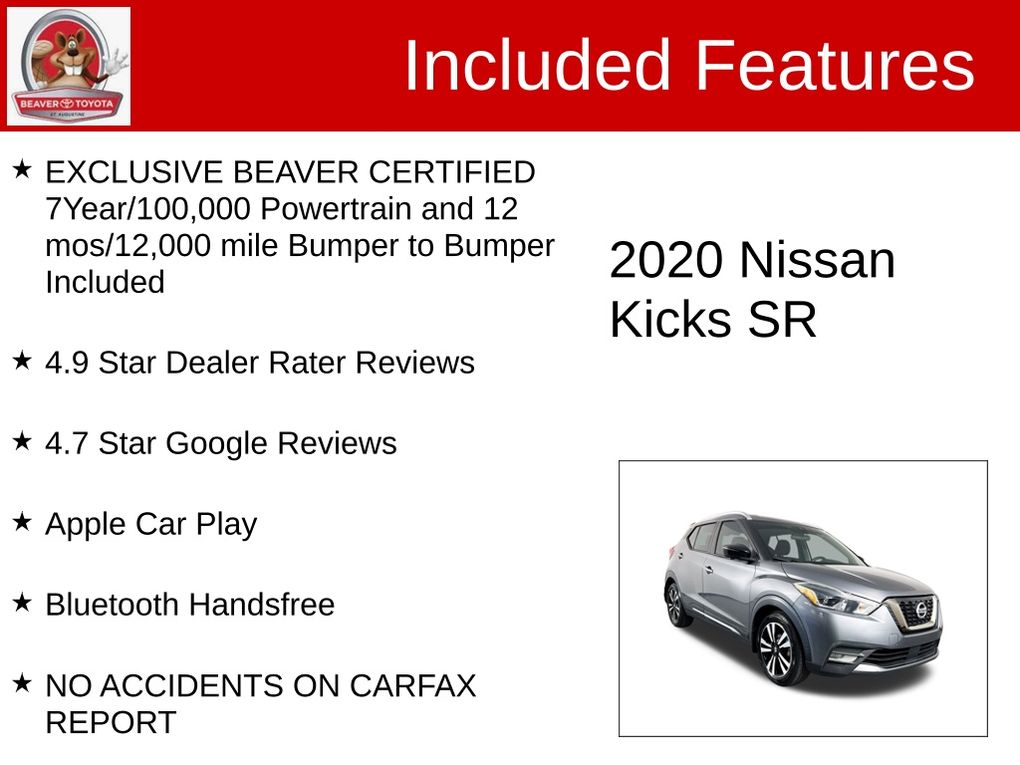 This 2020 Nissan Kicks SR is BEAVER CERTIFIED, meaning it has undergone a rigorous multi-point inspection and comes with a 7-year/100,000-mile powertrain warranty and a 12-month/12,000-mile bumper-to-bumper warranty. You can purchase this vehicle with confidence, knowing that it has been thoroughly inspected and backed by our exceptional warranty coverage.