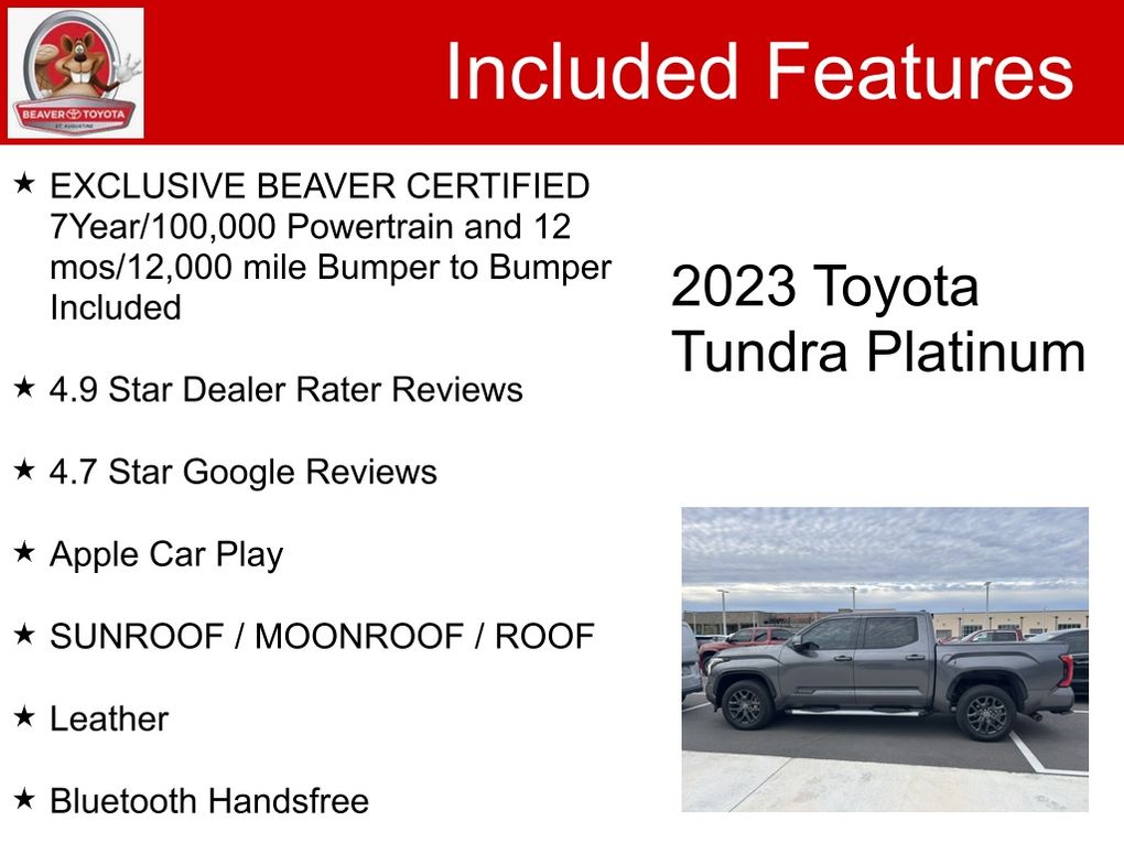 This Tundra Platinum has been meticulously detailed and is in excellent condition, ready to provide you with years of reliable service. The vehicle has been thoroughly inspected and comes backed by our exclusive Beaver Certified warranty, offering you peace of mind and the assurance of quality.