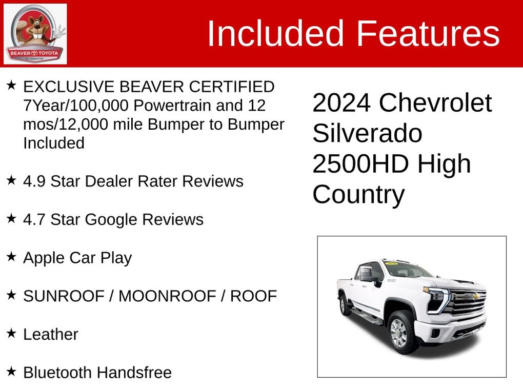 This Silverado 2500HD High Country is Beaver Certified, meaning it has undergone a rigorous multi-point inspection and comes with an unbeatable warranty. With a clean CARFAX report and a one-owner history, you can drive with confidence, knowing this truck has been meticulously maintained.