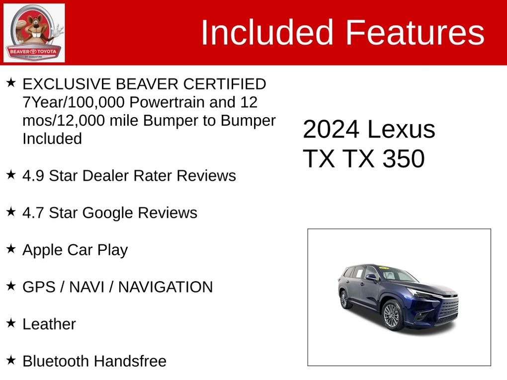 As a Beaver Certified vehicle, this 2024 Lexus TX 350 comes with an unbeatable 7-year/100,000-mile powertrain warranty and a 12-month/12,000-mile bumper-to-bumper warranty, giving you the peace of mind you deserve. With a 4.9-star Dealer Rater review and a 4.7-star Google rating, our commitment to customer satisfaction is evident in every aspect of the buying experience.
