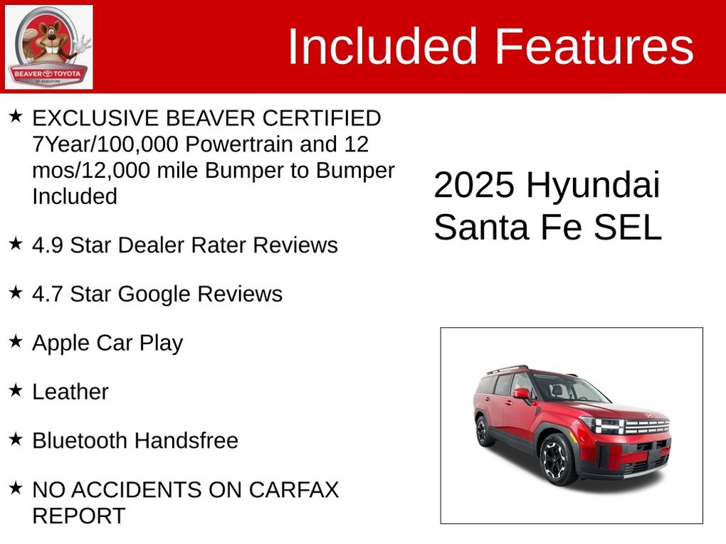 This 2025 Hyundai Santa Fe SEL is a Beaver Certified pre-owned vehicle, which means it has undergone a rigorous multi-point inspection and comes with an industry-leading 7-year/100,000-mile powertrain warranty and a 12-month/12,000-mile bumper-to-bumper warranty. You can drive with confidence, knowing that this SUV has been meticulously maintained and is ready to provide you with years of reliable performance.
