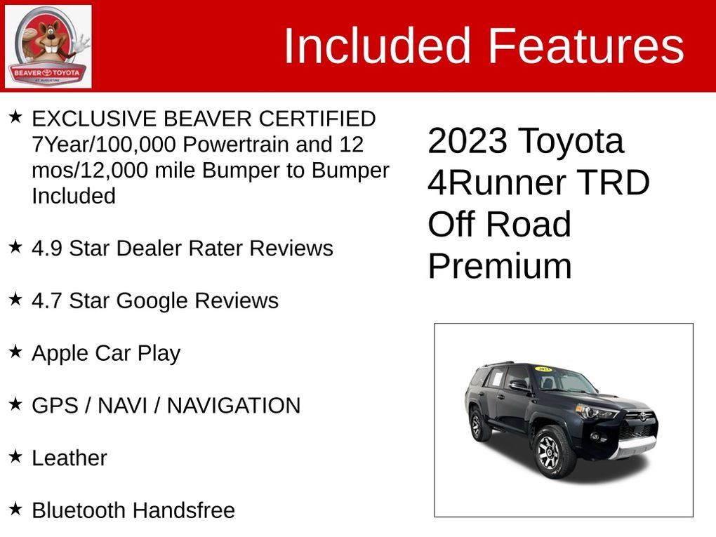CARFAX One-Owner. Clean CARFAX. Certified. EXCLUSIVE BEAVER CERTIFIED 7Year/100,000 Powertrain and 12 mos/12,000 mile Bumper to Bumper Included, 4.9 Star Dealer Rater Reviews, 4.7 Star Google Reviews, Apple Car Play, GPS / NAVI / NAVIGATION, Leather, Bluetooth Handsfree, NO ACCIDENTS ON CARFAX REPORT, BEAVER CERTIFIED*7 YEAR/100K MILE WARRANTY*$0 DEDUCTIBLE*BUY WITH PEACE OF MIND, Rear View Camera, LEATHER, One Owner, NONSmoker, Local Trade, MUST SEE!, Fresh Oil Change, Passed Beaver Certified Multi Point Inspection, Passed Dealership Inspection, Freshly Detailed, EXCELLENT CONDITION, Back Up Camera, Leather Interior, Alloy Wheels, Power Driver's Seat, Premium Wheels, LCD Display Screen, Fully Serviced and Detailed, A MUST SEE ,DO NOT MISS THIS 4X4 TRD PREMIUM 4 RUNNER ,BUY WITH CONFIDENCE ,THERES IS ONLY ONE DEALER IN THIS MARKET THAT WILL GIVE YOU FULL PEACE OF MIND ,BEAVER TOYOTA IN LITTLE ST AUGUSTINE !!, 4WD, Black/Graphite w/SofTex Seat Trim.