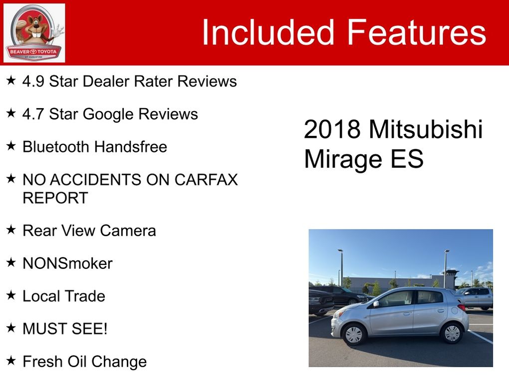 Backed by a clean CARFAX report and a thorough inspection by our certified technicians, this 2018 Mitsubishi Mirage ES is a true gem. Experience the difference for yourself and schedule a test drive today. We're confident you'll be impressed by the quality, performance, and value this Mirage ES has to offer.